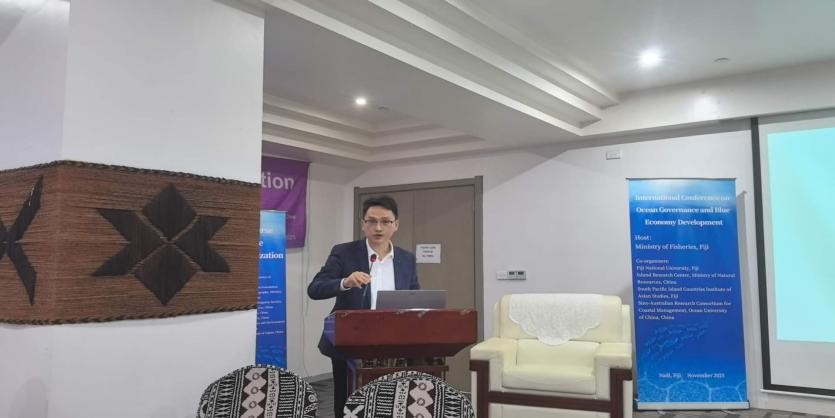 本次会议由斐济渔业部主办,来自中国海洋大学、浙江大学、武汉大学、重庆大学、华东师范大学、广东外语外贸大学、斐济国立大学等国内外多所高校和科研机构研究人员与会。会议主题为“海洋治理与蓝色经济发展”,旨在汇聚亚太地区的专家学者,就渔业资源管理、海洋生态保护等议题进行深入交流和探讨。计飞副教授以“Strengthen international fisheries cooperation and provide more public goods”为题进行发言。