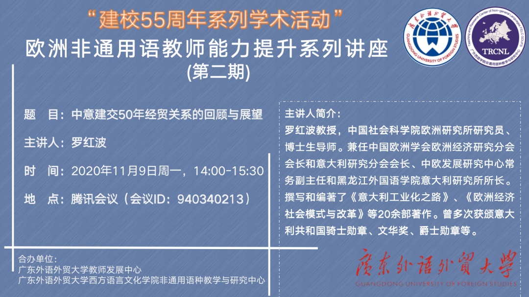 本网讯2020年11月9日下午,中国社会科学院欧洲研究所研究员、博士生导师罗红波老师为西语学院意大利语系师生带来了一场精彩的线上讲座。本次讲座的主题是:中意建交50年经贸关系的回顾与展望。