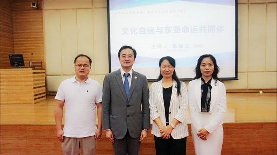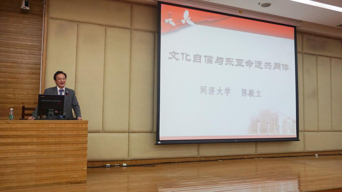 本网讯11月2日上午,同济大学外国语学院陈毅立副教授莅临我院作“文化自信与东亚命运共同体”主题讲座。讲座在图书馆负一层报告厅举办。学院党委书记周秀娇、副院长杨晓辉、副院长胡瑞、辅导员朱浩文以及我院18级学子参加并聆听了本次讲座。讲座由副院长杨晓辉教授主持。