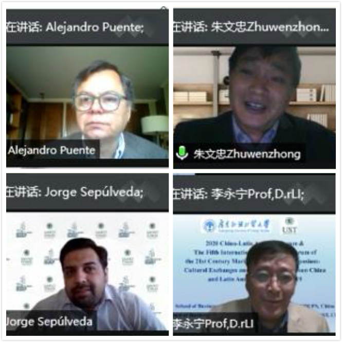 2020年12月12日,由广东外语外贸大学商学院、拉丁美洲研究中心,智利圣托马斯大学商学院、中国-智利研究中心联合举办的2020年中拉论坛“疫情背景下中拉人文交流与合作发展”暨第五届21世纪海上丝绸之路国际智库论坛(2020)平行论坛线上召开。来自广东外语外贸大学和智利圣托马斯大学商学院50余名专家学者和师生代表齐聚云端,围绕疫情下中国和拉美地区的热点问题展开深入探讨。论坛由广东外语外贸大学拉丁美洲研究中心副主任李永宁教授主持。