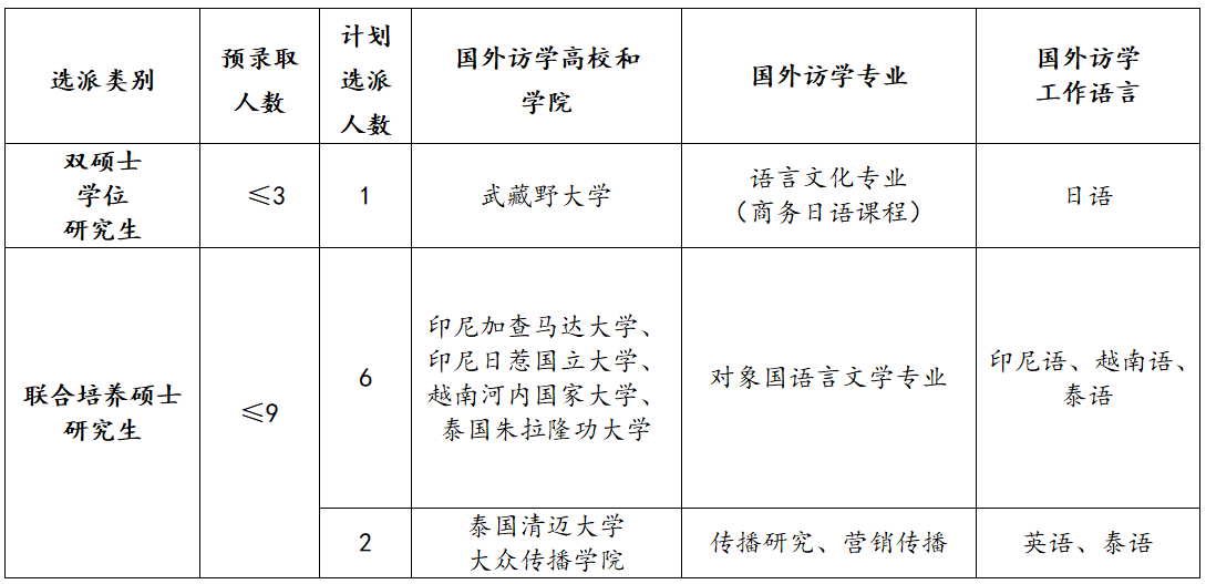 分别面向我校在读在校全日制一、二年级硕士研究生(年龄不超过35岁,1987年1月1日以后出生)进行选拔,预录取计划不多于9人,从中考核选拔8人派出。学员派出时须已修完我校第一学年学分。校内学习费用不变,派出学员可以申请享受国外学习期间国家留基委一次往返国际旅费和资助期限内的奖学金,国外学习时间不少于3个月。学校支持参加国际(区域)组织或企业实习的优秀学员申请国家留学基金委国际组织后备人才奖学金。
