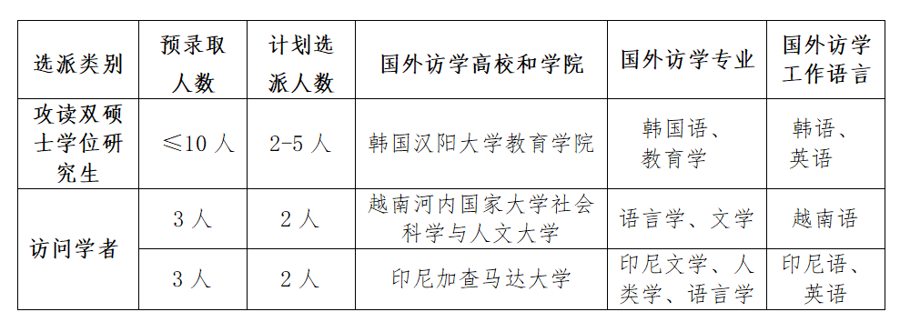 优先面向我校参与“RCEP校园”项目人才培养的学院的在编在岗教师(年龄不超过50周岁,1971年1月1日以后出生)进行选拔,本科毕业后应有5年以上工作经历,硕士毕业后应有2年以上工作经历。对博士毕业的申请人无工作年限要求。预录取计划不多于6人,从中选拔4人派出。派出人员可以申请享受国外访学期间国家留基委一次往返国际旅费和资助期限内的奖学金,国外访学时间不少于3个月。